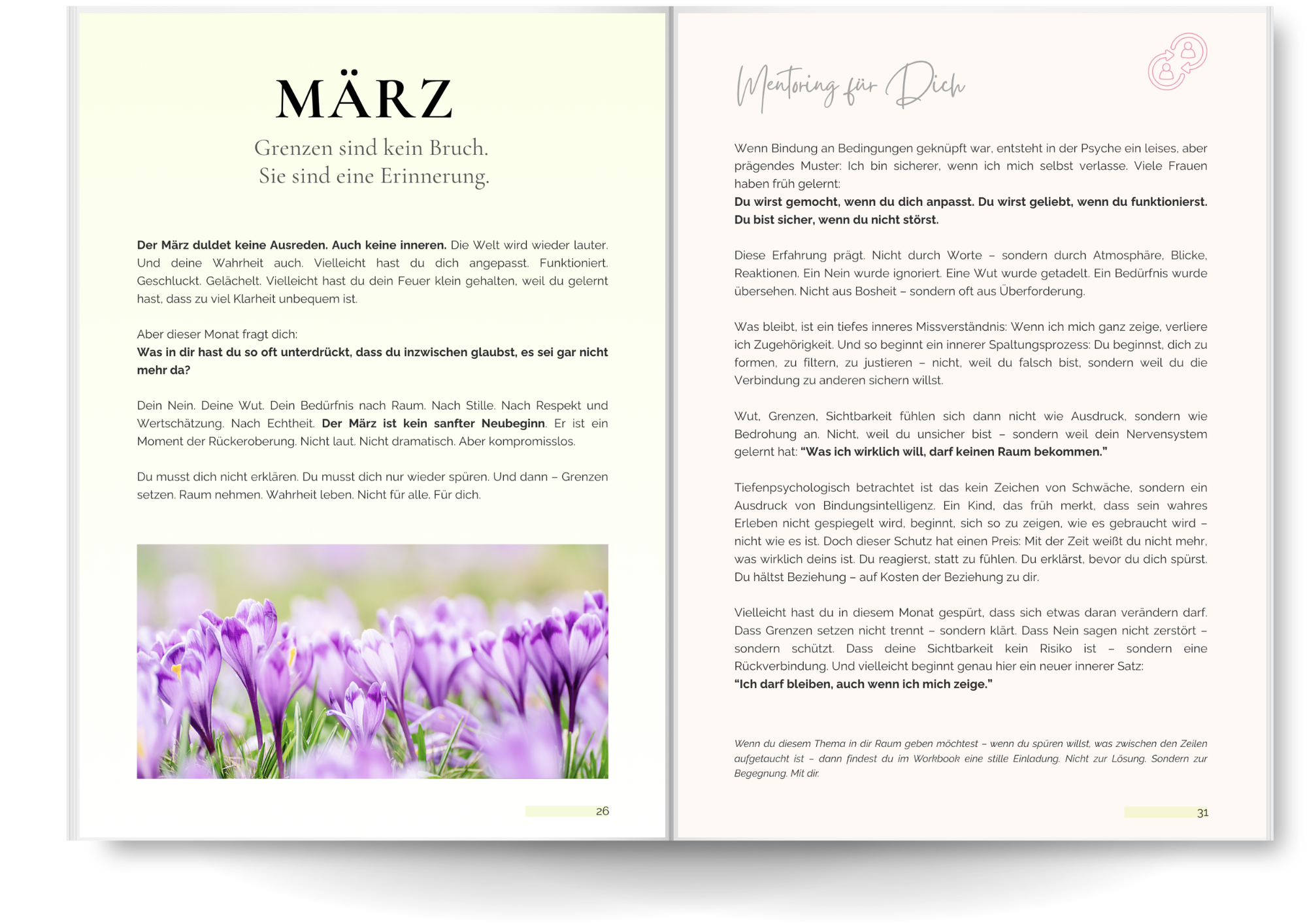 Der Jahresbegleiter inspiriert. Das Workbook vertieft. Gemeinsam begleiten sie dich durch zwölf Monate – in echte Selbstwahrnehmung und innere Klarheit.